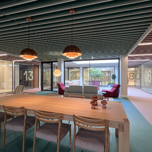The hub features 21 private offices accommodating teams of 2 to 16 people, 8 meeting rooms equipped with advanced technology, 6 soundproof phone boot, and a multi-purpose room with capacity for up to 50 attendees. It also includes generous common areas, such as a cantina, lounge spaces, and outdoor patios. Every detail is carefully considered, offering customized climate control and a design that balances functionality and well-being.